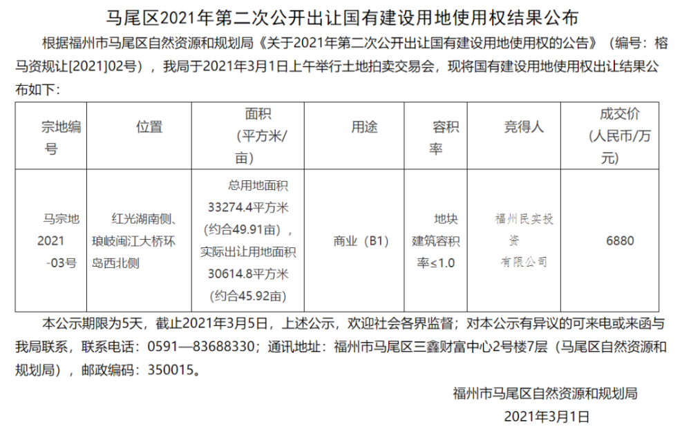 最终,6号竞买人福州民实投资有限公司以底价6880万元竞得马宗地2021-03号地块,平均成交楼面价为2247元/㎡。