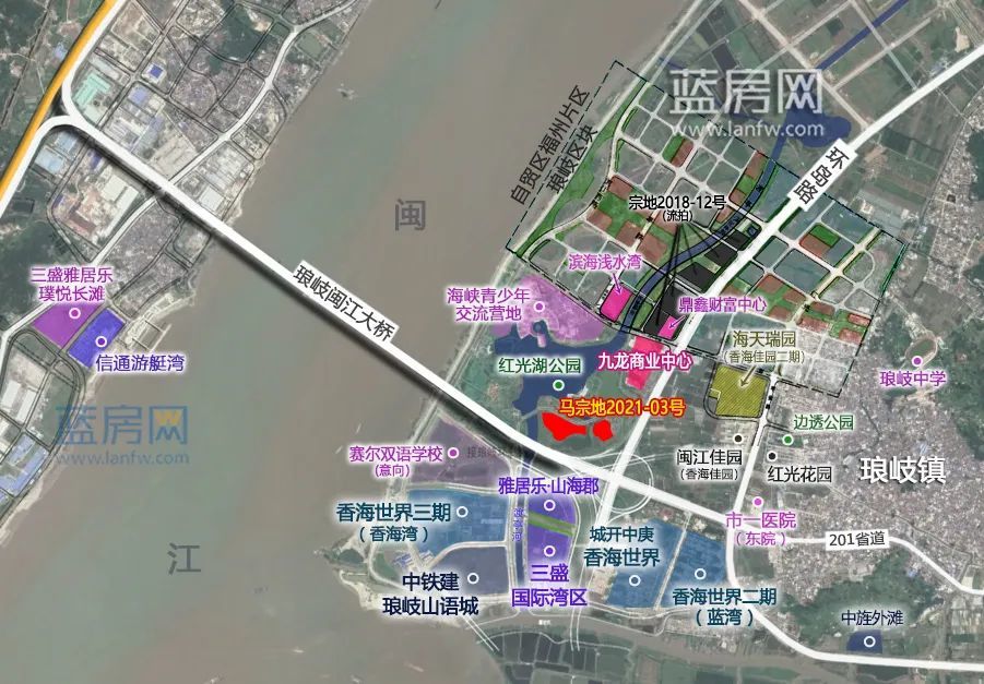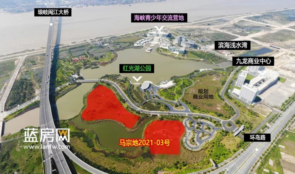 该地块位于红光湖公园内,东临环岛路,交通便捷,同时紧邻自贸区福州片区琅岐区块。根据规划,马尾区将依托红光湖“三创”基地,打造环湖科创走廊。地块周边配套有市一医院东院(琅岐分院)、红光湖公园、琅岐赛尔双语学校(意向)、边透公园、海峡青少年交流营地及九龙商业中心等配套。地块东北侧未来还规划一幅商业用地。