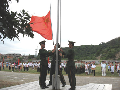 上午七点整,晴空万里,旭日东升。边防官兵与海云中学的同学们迈着整齐的步伐进入会场。庆祝祖国58周年华诞的升旗仪式正式开始了,在海云中学校校领导的主持下, 学校全体师生和边防官兵肃立在大操场,在雄壮的国歌声中,人们目视鲜艳的五星红旗冉冉升起。