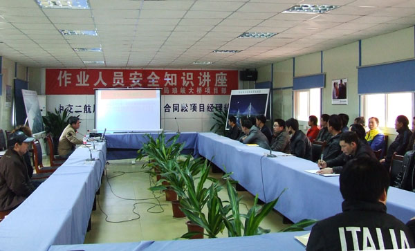 为加强项目施工安全管理,强化一线作业人员安全施工意识,提升中交二航局整体形象,中交二航局琅岐闽江大桥项目部为农民工举办安全知识专题学习班,邀请了大桥指挥部安监科科长林金鸣前来讲课。项目部领导、全体职工以及各个施工作业班组人员均参加了学习。由于施工现场昼夜均要加工生产,此次培训分批次进行,累计参加培训的人员达到100多人。