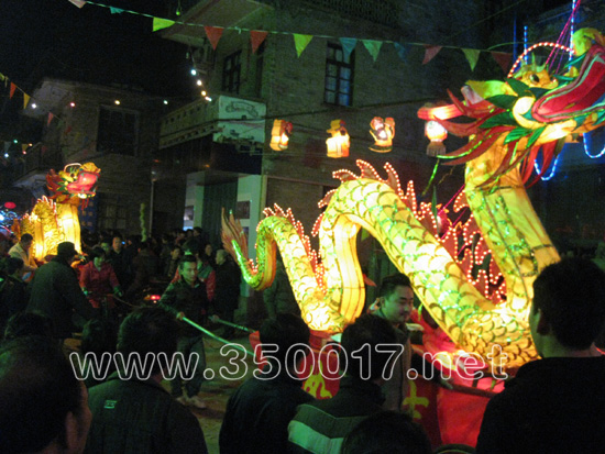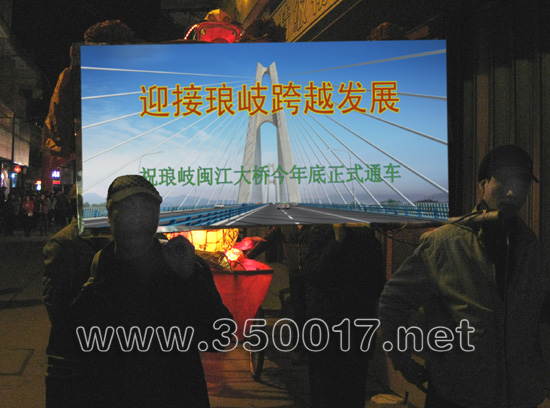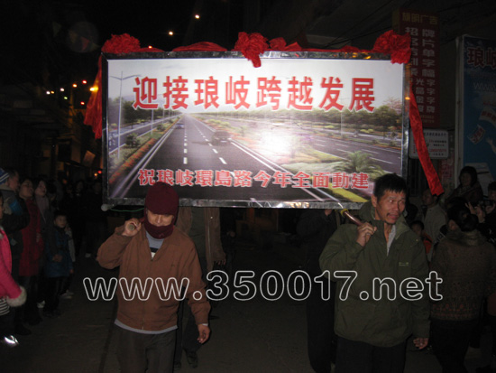 两条巨龙彩灯和十二生肖灯紧接在“平安灯”之后,栩栩如生,流光溢彩。接着便是“迎接琅岐跨越发展”巨型灯箱,显示今年游灯活动的主题,“祝琅岐闽江大桥今年底顺利通车”和“祝琅岐环岛路今年全面动建”的标语与背景图案十分醒目。