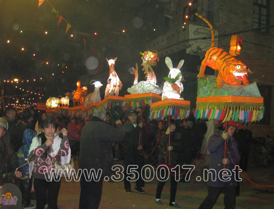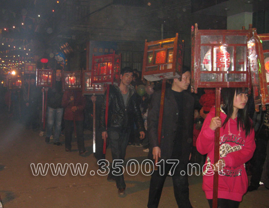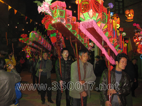 喜灯之后是“透灯”队伍,有一百多“透”。所谓“透灯”就是“排灯”,“T”形木制的灯架上并列着七盏灯笼。灯笼做得十分精致,有各种形体,贴上各种精美的剪纸,这些剪纸图案有花鸟人物,有“福、禄、寿、喜”字样,巧夺天工;灯笼内点着蜡烛,晶莹剔透,光彩照人。“透灯”象征着福禄满堂,全家平安和顺。相连的“透灯”走起来,绵延数里,像闪亮的彩龙宛延蠕动,非常壮观。