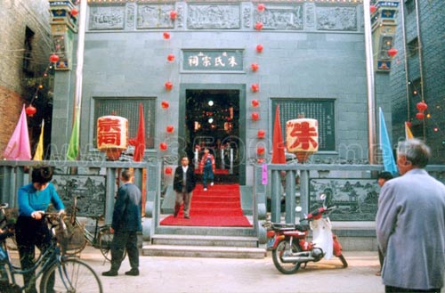 “朱氏宗祠”背山临街,始建于明宣德十年(1435),至今已有五百六十多年历史。宗祠面宽11.5, 纵深43, 建筑面积473.5平方米。祠为三落透后, 穿斗抬梁木构, 极具明清建筑风格。这个祠堂突出地表现儒家思想,倡导“忠、良、孝、友”,墙面镌刻有“朱子家训”和“朱伯庐治家格言”,大厅取名“敦厚堂”,厅壁镶嵌有朱熹手迹与“忠、义、节、孝”人物形象石雕,楹联撰文也多是赞颂理学宗师的,这些都表现对儒家精神的崇尚。中厅正中高悬“文苑精英”匾,这是表彰朱立容先生事迹的。朱立容先生是1952年台湾高考状元,台湾东吴大学、名传大学教授,是国际著名经济学家。他热爱祖国,热爱家乡,捐资四百多万元发展家乡教育等公益事业,荣获福建省政府授予的“乐育英才”光荣称号。他撰诗曰“两岸本是同根生,时势弄人各自飞,但愿干戈玉帛化,共创中华万世春。”表现了台湾同胞渴望祖国统一的爱国热忱。