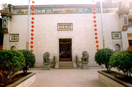 “江氏宗祠”位于螯山北麓 也是临街而建,是福州十邑名祠之一。宗祠始建明万历年间,至今也有四百余年历史。宗祠宽16米,长40米,建筑面积640平方米。宗祠右边建有妥遗祠。宗祠四周火墙包脊,飞檐走壁,祠前双斗旗杆屹立左右,一对石狮獠牙舞爪。大门前有三级台阶,台阶旁边镶有抱鼓石。宗祠的门墙高大,中间“江氏宗祠”四字烫金楷书饱满工整。两扇边门上各刻“入孝”、“出悌”两字。从门面观之,蔚为大观,符合宗祠建筑规格。最为难得的是祠内十多幅楹联汇总近现代官宦名人如民国海军部长萨镇冰、民国福建省主席杨树庄、民国陆军上将林之夏、民国中央立法委员刘通,以及书法家王元龙、洪亮、锡元、郑复初、沈觐冕、朱棠溪、郑乃光、潘主兰的墨宝,各呈风采,令人驻足观赏。