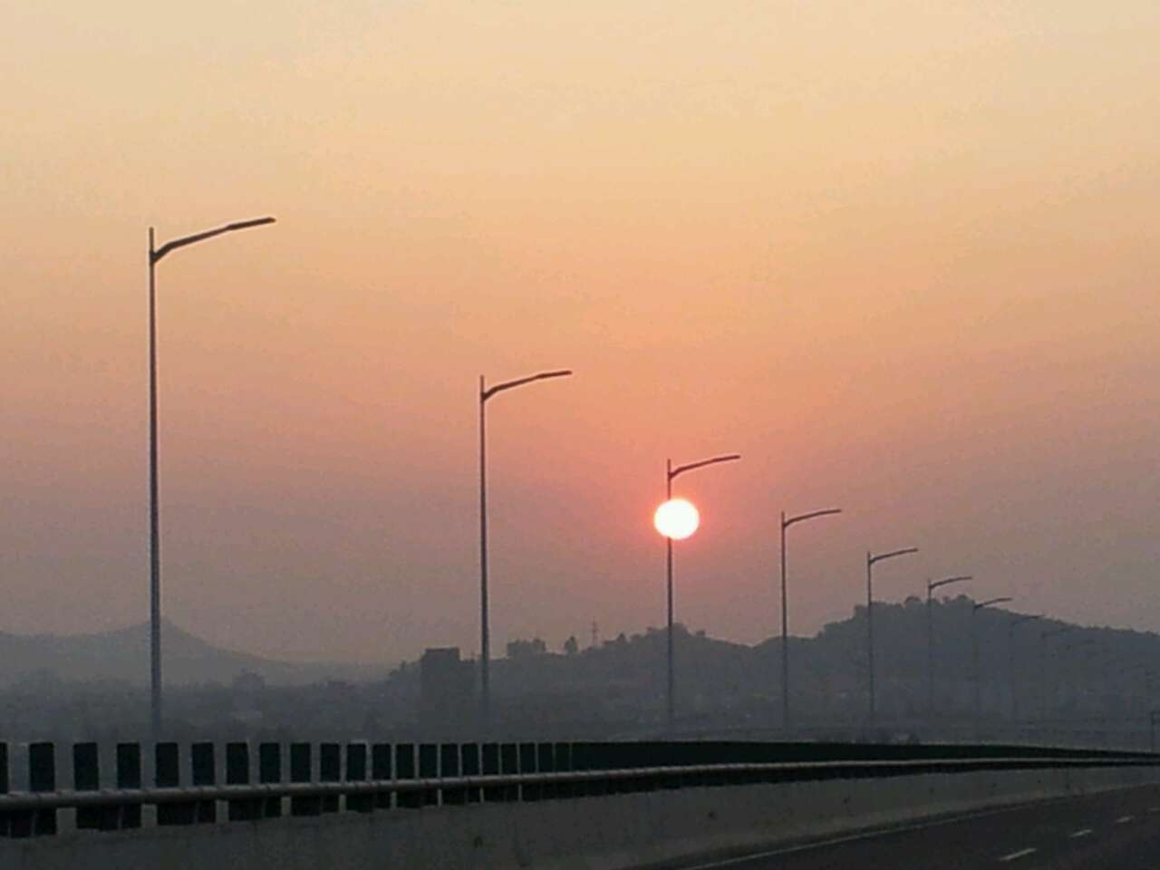 早上六点,市区出发,七点,在国道等红灯时,看见了一个红彤彤的大圆盘挂在车窗右前方。不是为了看日出,但太阳撞进了你的眼帘, 了你一大跳。这红是从来没有见过的,色彩饱满,就像一个熟透了的大福橘;也像一盏天安门城楼刚挂上的新宫灯;更像那个邻居家可爱的孩儿的脸,红扑扑的,因为过新年穿新衣而笑得更加灿烂……