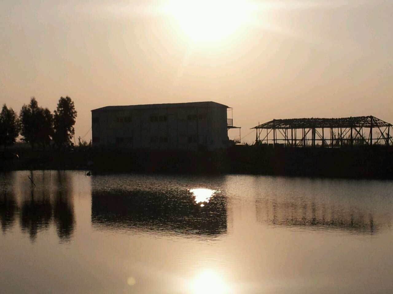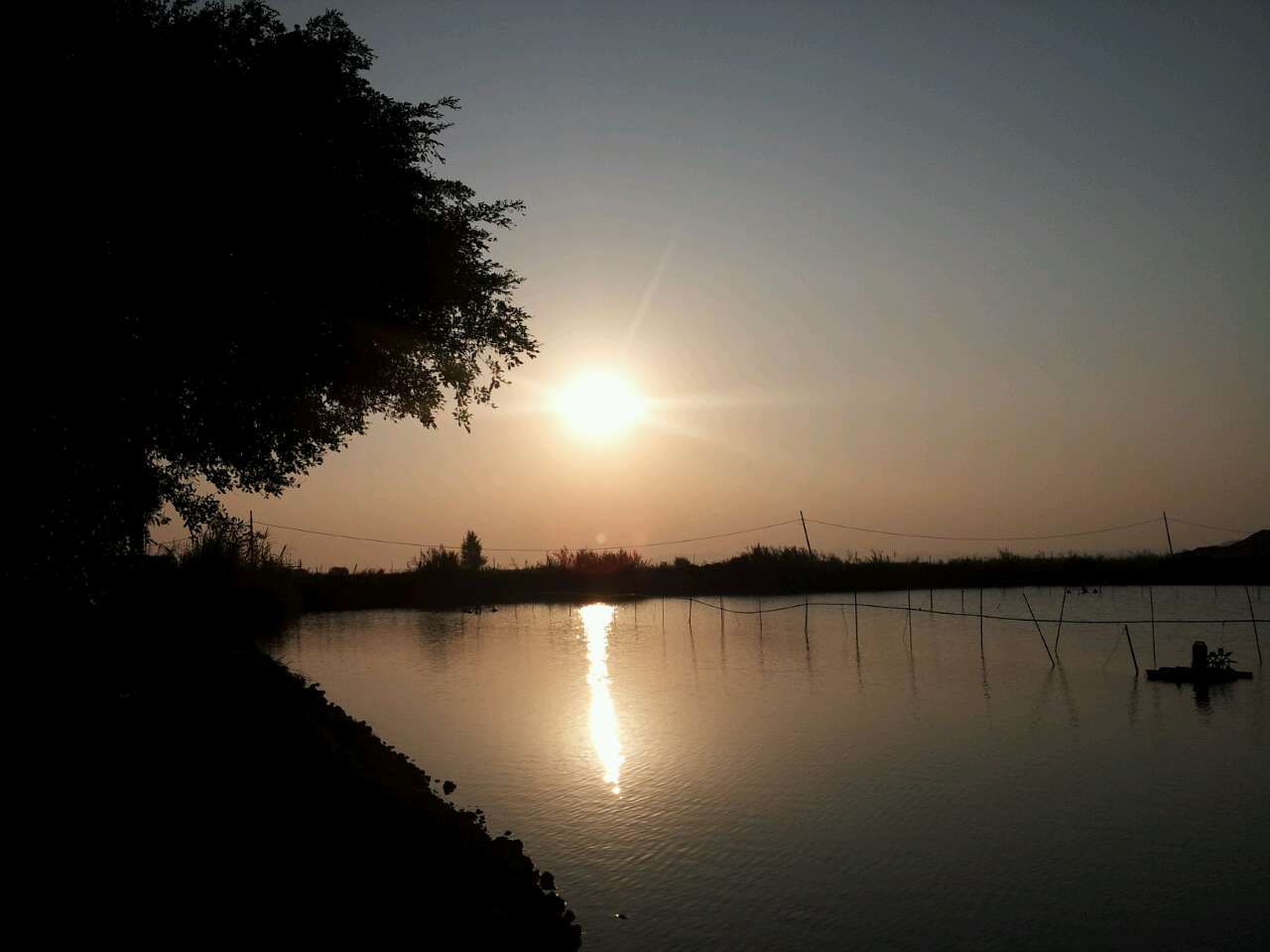 一幢黑色的房子,右边一个黑色的棚子,左边数棵黑色的树。上面挂着一个升起的太阳,发出刺眼的光,它的倒影在水里,依然是冲击力无限。但经过房子的遮挡,落在房子脚底下的另一颗太阳,变成了一盏青花白瓷的酒盅,似乎要把满池塘的水都当作陈年的佳酿,邀请四方来客一醉方休。朦胧里,我还发现了第四颗太阳,它正藏在水的底部,朝着你狡猾地笑着呢。这莫不是月亮的倒影?不可能,今天是农历十二,月亮不可能提前爬上来的。一个镜头里看到了四个太阳,你见到过吗?