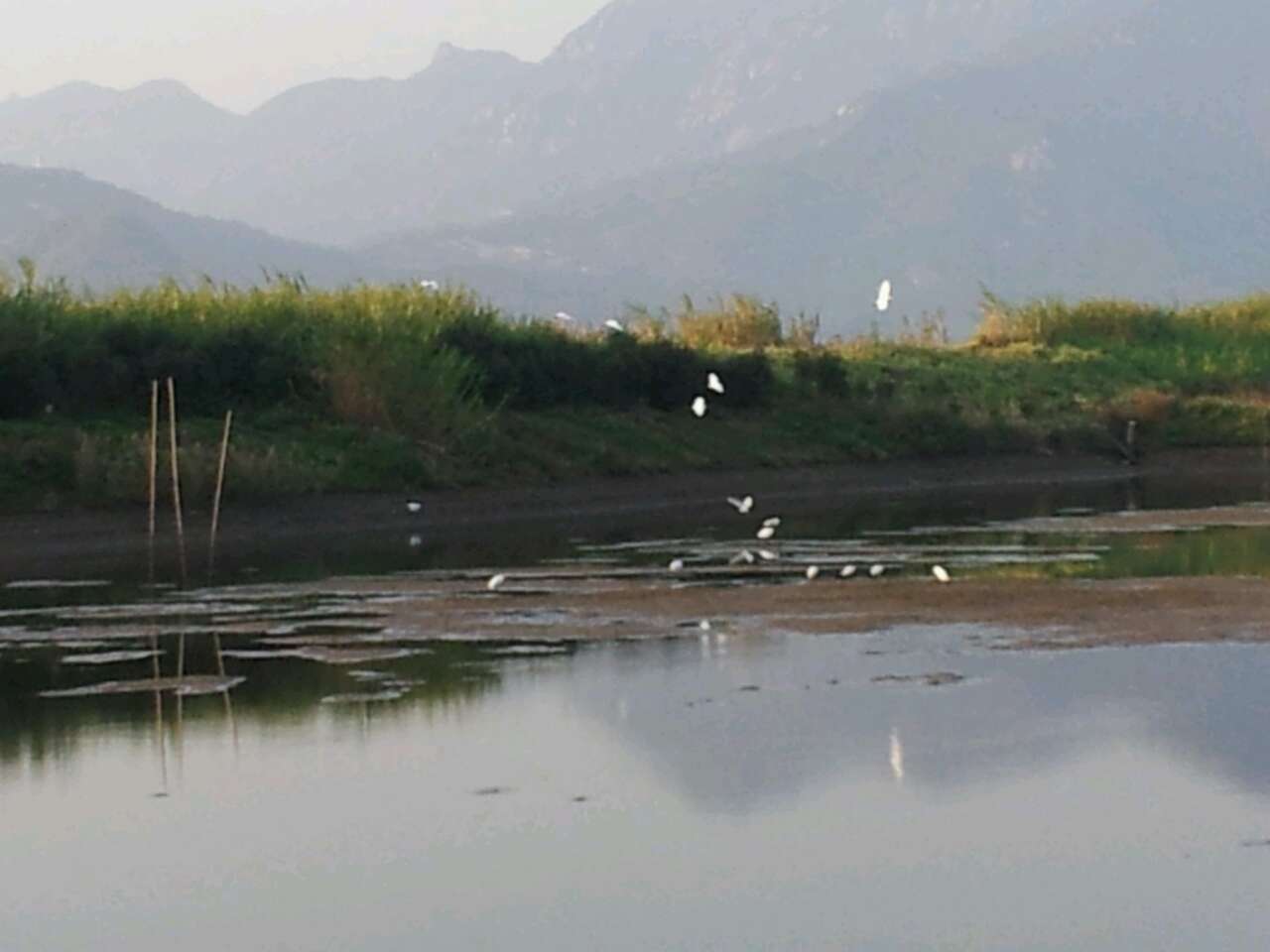 逐渐开朗的天带着远处的朦胧的山,倒映在碧水里,在一片长满了一人多高芳草的田埂下,无数白鹭正站在滩涂上觅着食,三三两两,东南西北,卿卿我我,惬意无比。远远望去,白鹭就像镶嵌在蓝天碧洲上的一颗颗白色的钻石。我不禁轻声呼唤了一声,不曾想,它们听到了,一个一个展翅飞起,在水面上起舞盘旋起来,仿佛知道客人的光临就是为了拍下它们的娇媚矫健的身姿和喜悦快乐的表情。