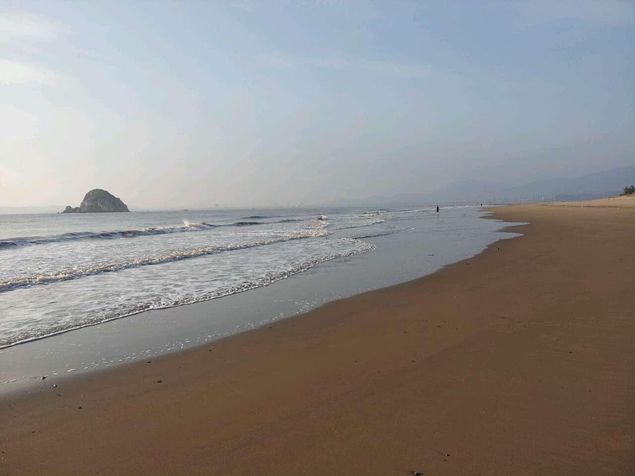 往前一拐弯,看到大海了。太阳已经高挂,就像一个白色圆球,发出刺眼的光芒,把远方妆饰成了一幅色彩丰富的巨幅油画:最近黑黜黜的是岛屿,大海深处是金紫色的霞光,再往上,慢慢过渡到了蓝天,蓝天上还有几道依依不舍的白云。白球在江面上洒下的光辉,把江水分割成了两半,一半是黝黑的,另一半也是黝黑的,只是中间这一道,波光粼粼、晶莹闪亮,充满力量。定睛一看,有个人站在海边,想必与我一样,正对着太阳浮想联翩呢。走下沙滩,左边的巉岩金鸡依然在报晓,只不过因为晨曦的照耀,雄鸡在蓝天下显得更加有风度、有气势、有未来。沙滩上的沙似乎变得细腻了,一脚踩下去,也比以往柔软了许多哦。关键是,以前看到的垃圾少了,海水也喜欢上了这里,不断向脚面涌来,亲吻着,再留下道道白色的小花朵,就像在新年的早晨写下的一道道祝福的诗行。