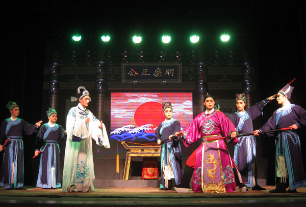 这次马尾海峡闽剧团献演的剧目是《京城县令》,通过一个案件的审理,表现县令李自清秉公执法,和知府周泯徇私枉法,两者截然不同的为官之道,赋予了人物特殊性格,诠释了法制深层次的思想内涵,极有现实教育意义