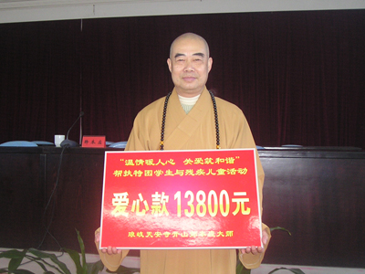 会上宣读了关工委爱心基金会的“温情暖人心,关爱筑和谐“倡议书,倡议人们以责任和良知,伸出热情的双手,用爱心点亮特困学生与残疾儿童的希望。琅岐天安寺本应大师慷慨解囊,捐款13800元,其他单位和个人也涌起捐助热潮。点滴关爱,必将汇成巨大的暖流,温暖许多渴求关心的青少年的心灵。