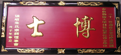 今天,琅岐下岐朱氏宗祠为荣获博士学位的朱泳、朱磊俩兄弟和朱玲(女)授匾,表彰他们学业有成,激励年轻一代奋发向上,积极进取。