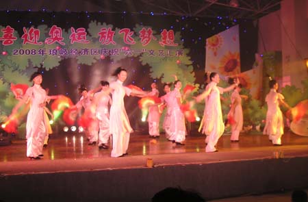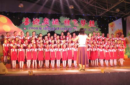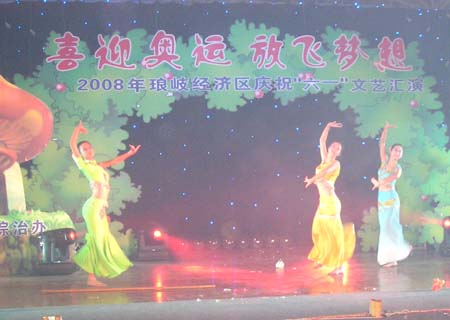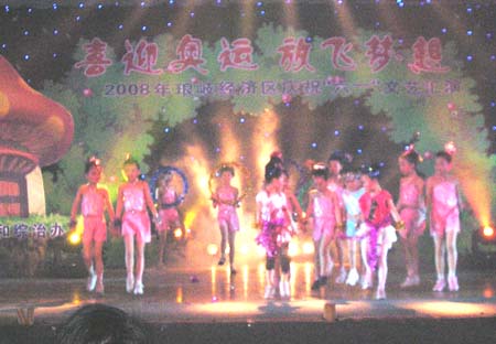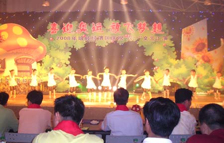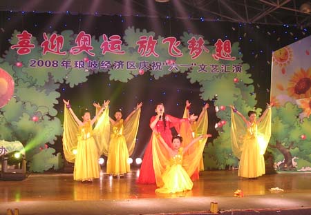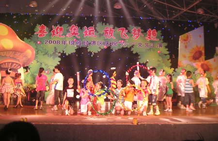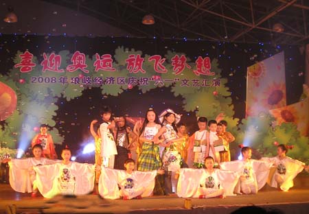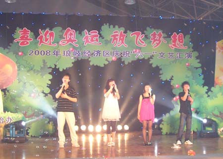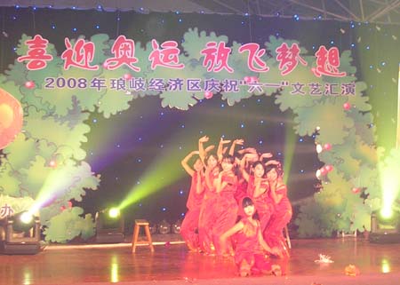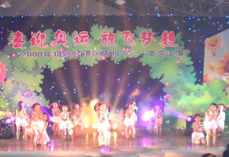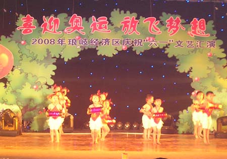 由琅岐经济区社会事务和社会治安综合治理办公室主办的“2008年琅岐经济区庆祝六一文艺会演,5月27日在吴庄华侨小学艺体楼礼堂拉开帷幕。这台会演在黄乃杰等老师的指导下,由各中小学与农林大学东方学院精选的节目,精彩纷呈。会演帷幕拉开,第一个节目是琅岐实验小学合唱队,85位小朋友激情歌唱《美丽的琅岐岛》和《五环童话》,表达了少年儿童对家乡的热爱和对北京奥运会的热切期盼。第二个节目是孝先幼儿园群舞《我为奥运加把力》,优美的舞姿,表达了儿童们喜迎奥运的欢乐。第三个节目是琅岐中学初一学生的诗朗诵《勇敢地迎接下一个春天》,学生用激情的语言,表现中国人民在党中央的领导下,众志成城,抗震救灾,的英雄气概。接下来的节目也都非常精彩,欣贝幼儿园的舞蹈《妈妈亲,老师亲》,把少年儿童在自己欢乐的节日里,无比美好的感恩心情表现得淋漓尽致。欣贝幼儿女教师表演的舞蹈《榴花似火》,轻盈优美,表达了人们对美好未来的憧憬。吴庄华侨小学的舞蹈、走秀《说唱脸谱》,富有情趣,表现了少年儿童的天真活泼,和对中国传统文化的热爱。还有农林大学东方学院小组唱《歌曲串烧》,激情豪迈,表现了当代大学生们的理想,和对生活的热爱。整台晚会高潮迭起,掌声不断,气氛及其热烈。会演结束后,琅岐经济区领导李明、黄志明、郑是平、许善坤等走上舞台,祝贺演出成功。