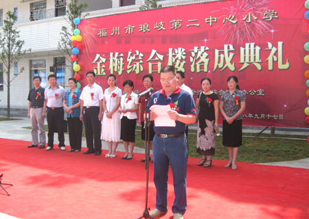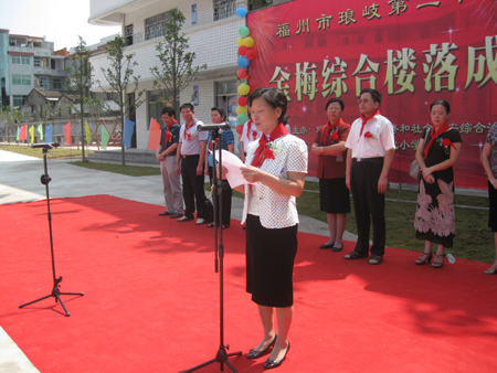 典礼由区社会事务和综治办主任翁捷灵主持,琅岐第二中心小学校长陈治锦介绍了金梅综合楼建设情况,琅岐经济区黄志明副书记与省妇联王副主席分别作了致辞,黄志明副书记还代表琅岐受赠单位向金梅女士赠送锦旗和纪念品。