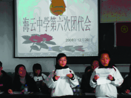 海云中学第六届团代会胜利召开。这次会议本着公平、公开、公正的原则,由海云中学48名团员代表选出了学校团委委员,团员代表都公正的行使了自己的代表权利进行选举。