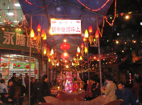当夜幕降临,在各个殿堂进行了“开堂”大礼之后,大王才跚跚登场。每位大王均由四位年轻力壮的信男抬着,左右信士簇拥着、吆喝着、呐喊着,抬到各处(过去是各家各户,现在几家几户联合)享用神宴。神宴非常丰盛,供祭品有全猪全羊,山珍海味,四季水果,还有摆设古玩花卉,应有尽有。在供祭过程中道士念念有词,吟诵祈求平安颂语诗句,信男信女则焚香顶礼膜拜。拜祭结束,大烧纸钱,大放烟花爆竹。烟雾腾腾,响声震天动地,迎神活动也达到了高潮。