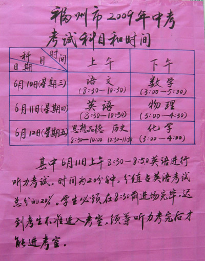 琅岐地区2009年初中毕业、升学考试今天在琅岐中学考点开场。今年参加考试的应届初三学生共410人,这是历届考生最少的一届(最高一届考生多达一千三百多人)。