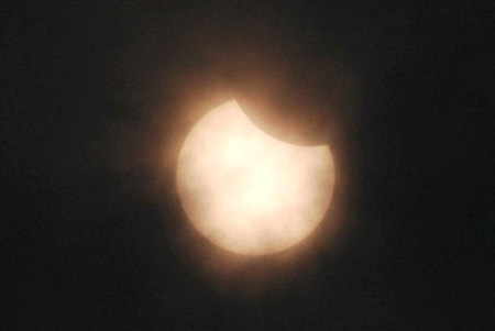 琅岐日食大约从早上9时半开始,遗憾的是我们只能观看到日偏食。许多人用x光胶片,或戴上黑色墨镜观看。大家都看到太阳成了月牙型,很特别,日食甚时太阳被月亮遮挡的比例大约百分之七十,空间光线明显暗了许多。