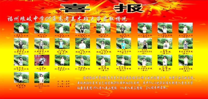 琅岐中学自从2003年美术特色班创办以来,平均每年本科通过率都保持在90%以上。2009届美术考生依然成绩显著喜报频频,美术文考和专业成绩上本科线91.6%,其中36位美术考生,33人通过本科线,重点本科院校上线17人,一般本科院校上线16人,其中庄嘉伟考生的专业成绩在全省排名第四,全市排名第一,并被国家一级美术学院重点大学天津美术学院录取。