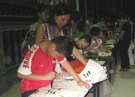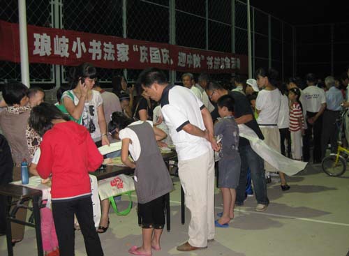 八月十五中秋节,皓月当空,秋风凉爽。为庆祝中华人民共和国成立60周年,暨欢度传统中秋佳节,琅岐红旗管理区、琅岐实验小学和琅岐书画联合举办“小书法家笔会活动”在红旗文体活动中心(牛屿山公园)灯光球场举行。琅岐实验小学30多位书法爱好者在明媚的月光下挥毫泼墨,吸引了众多大人观赏。孩子们稚嫩小手握着大笔,潇洒自如表演,他们熟练的技艺,受到大人们的热棒,为文明过节增添了欢乐的气氛。