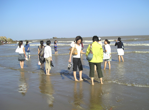 这里沙滩广阔平坦,细沙纯净,漫步其上,柔软柔软的,细沙从脚趾缝冒出来,真有别样的感觉。孩子们就喜欢在这里玩沙,堆沙人,挖沙洞。当然,最让孩子喜欢的还是捉小蟛蜞。绿豆大小的蟛蜞,在掌心上爬动,痒痒的,可有趣。捉几只装在矿水瓶带回去,难忘此行。