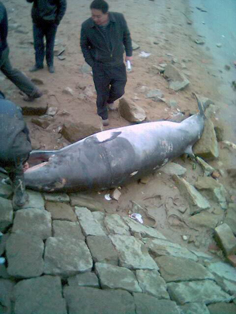 24日中午,东岐轮渡码头,一渔民从江上拖回一只身长近2米的“海豚”,引起众多旅客围观,可惜“海豚”已经死亡。