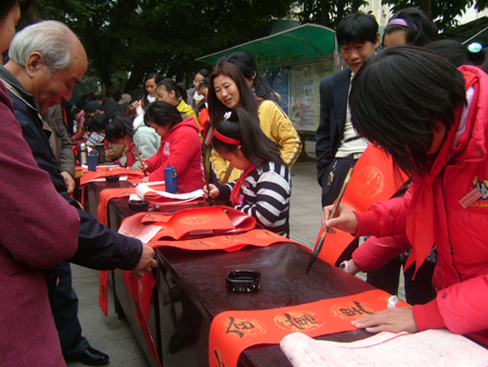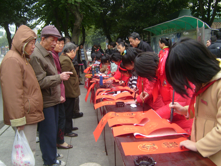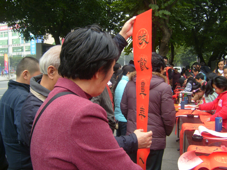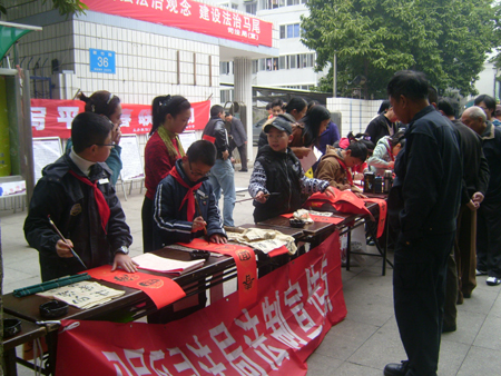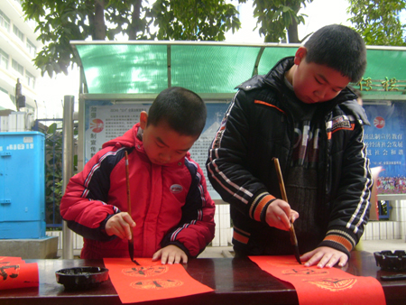 随着春节一天天临近,这年味也渐渐地浓厚起来。 1 月 29日,马尾区步行街,一群挥毫泼墨的少年吸引了众人目光。为宣传法律进社区,倡导“文明过年 平安创建”,马尾区司法局举办了为民赠写平安春联活动。这次赠写平安春联活动由琅岐实验小学16位小书法家专程从琅岐来的,小朋友在街头,现场为过往群众挥春,显示了良好的书艺,受到大人们的热棒。这些“小书法家”最大的13岁,最小的仅8岁,别看他们年纪小,可大多在全国、省、市少儿书法比赛中获过奖。半天下来,孩子赠写了200多幅春联。“和顺一门有百福,平安二字值千金”、“ 五湖四海皆春色 万水千山尽得辉 ”等联句表达了盛世的无比温馨……孩子们稚嫩的小手为群众送去美好祝福,尽管脚站酸了、小手写麻了,可他们一刻也没歇着,能够熟练运用传统书法技艺,为群众欢度新春佳节增添一份吉祥喜庆,孩子们都很开心。活动现场,同学们还向群众分发了春运安全、法律知识宣传材料。