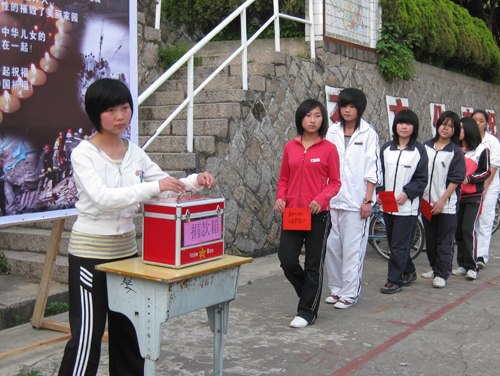 之后,师生进行了救灾捐款仪式。各班代表将救灾款投入箱里,显示出中华学子对灾区人民深切关注的炽热情怀与