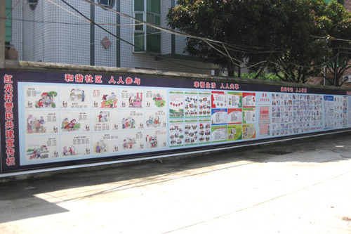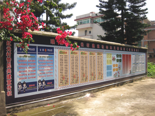 在红光村村委会周边平整的墙体上有巨型宣传栏,十分引人注目。这是琅岐边防派出所和红光村村委会警民共建的大型宣传栏。宣传栏平面面积达一百多平方米,气势恢宏。宣传栏内容十分丰富,有建设社会主义新乡村、普法教育、防灾救灾常识、应对突发事件措施、崇尚科学反对邪教、远离************、远离赌博、反对偷私渡等等。宣传栏版面设计美观新颖,图文并茂,绘制清晰,色彩艳丽,可见策划者的匠心,是难得的社会公共宣传基地。目前观览者络绎不绝,更有许多中小学学校组织师生集体观看。