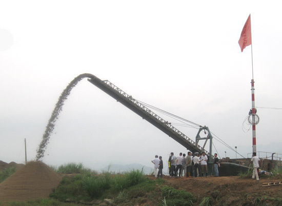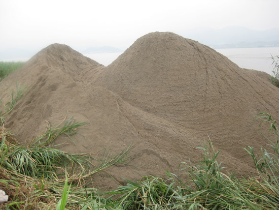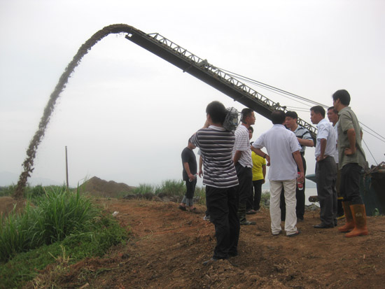 大桥建设工地圈地60多亩,“场平工程”正紧张进行。吸砂船在江中采砂(不在琅岐岛岸边水域采砂,以免造成驳岸崩塌水土流失),之后装载至大桥建设工地临近定位,再通过泥浆泵及输送管线将砂吹填到工地位置。