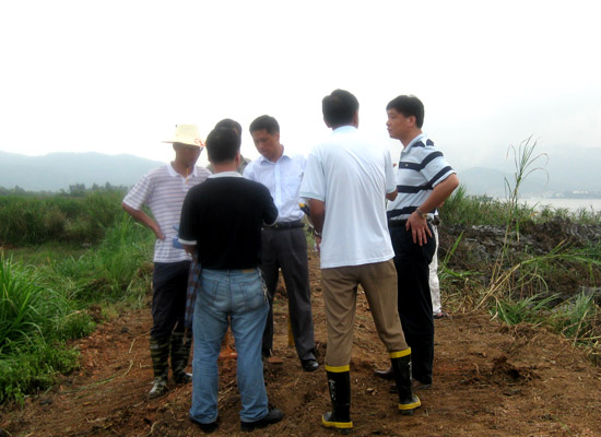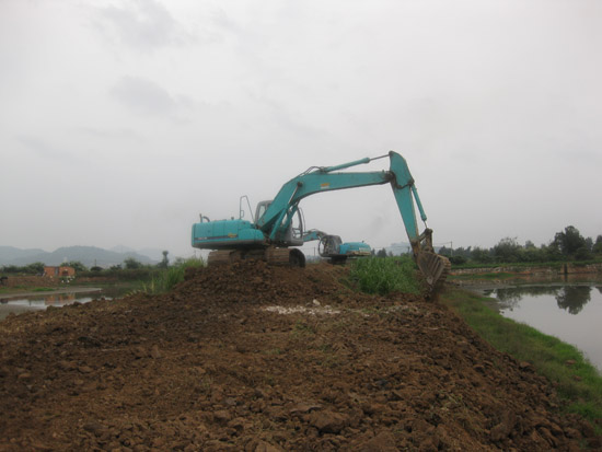 这里原有三口大鱼池,吹沙填土量将达10万立方米。土地平整之后,这里将搭盖起座座工棚,放置无数建桥器材……