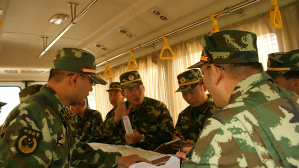 前指人员正在开往突发事件现场的指挥车上部署行动方案