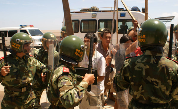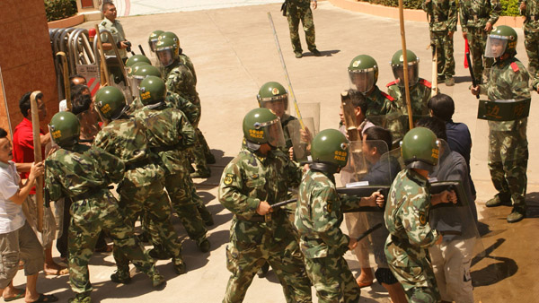 担任处突防暴任务的执勤官兵盾牌阵阻隔聚众闹事人员