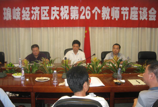 在迎接琅岐岛大建设大开发的时候,在琅岐闽江大桥即将开工建设的令人振奋的日子里,我们迎来了第26个教师节。今天,琅岐经济区召开庆祝第26个教师节座谈会,参加座谈会的有琅岐中小学学校领导、先进教师和退休教师代表。琅岐经济区党工委副书记、教育党委书记黄志明代表区党工委、管委会向全区教育工作者致以节日的祝贺,他向与会者通报了近年来琅岐教育事业健康发展的成就,以及琅岐岛大开发大建设的大好态势,展望琅岐教育事业的美好明天,给大家巨大鼓舞。琅岐经济区社会事务和综治办主任翁捷灵在座谈会上畅谈了学习胡锦涛总书记在全国教育会议上的重要讲话的体会,他说,胡锦涛总书记的讲话表达了党中央“强国必先强教”的方针,表示了对教育事业的高度重视,和进一步改善教书育人环境,提高教师待遇的决心,使我们倍感亲切鼓舞,和肩负的责任重大。座谈会上,与会的代表们积极发言,表示努力做好本职工作,不断提高自己的思想政治水平和文化业务水平,掌握教育教学工作规律,教书育人,为人师表,为祖国为家乡培育高素质人才,让群众满意,让学生家长满意。大家还就琅岐当前琅岐教育存在的一些问题进行研究并提出许多建议。