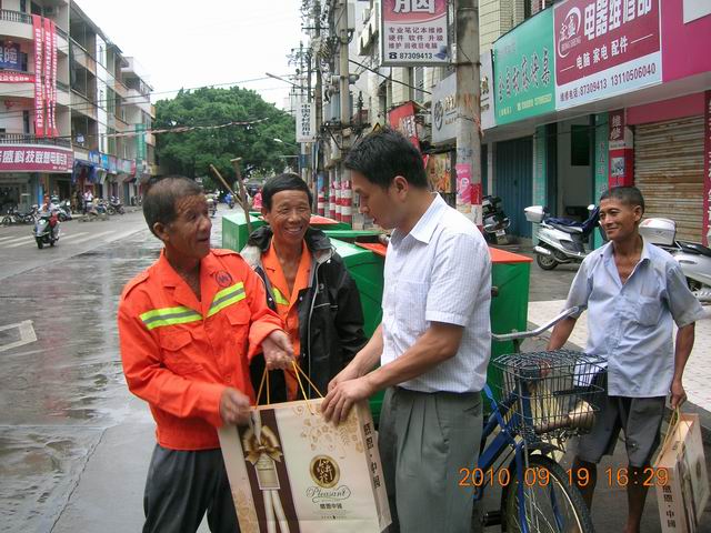 中秋节将至,为了表达对环卫工人的关怀和祝福,感谢他们为创造优美洁净的市容环境所付出的辛勤劳动,琅岐镇政府向全镇环卫工人致以节日的问候,并为他们送去中秋月饼。
