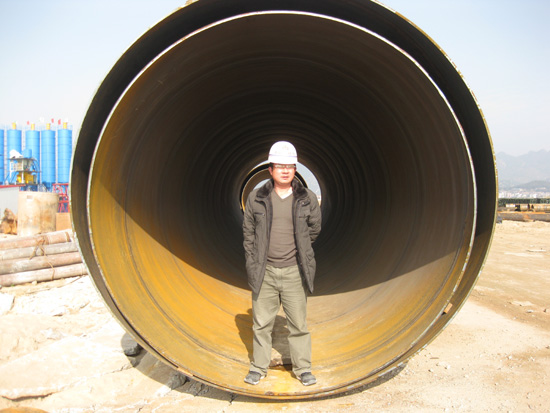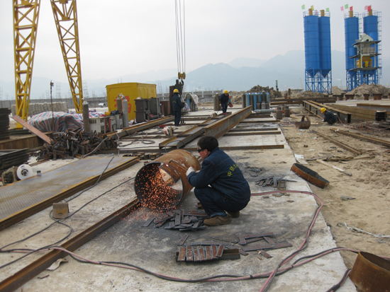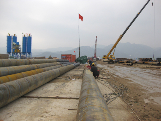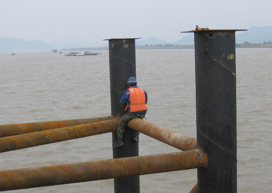 在琅岐大桥施工现场,我们看到琅岐闽江大桥建设指挥部的红旗高高飘扬;工地有序地摆放着无数建桥器材,各种口径的钢管特别多;其中护管口径达到2.5米,是用以桩孔定位的;高大的打桩船停泊在栈桥旁边。