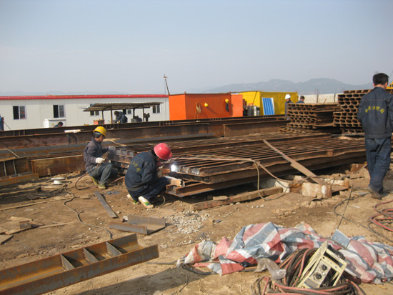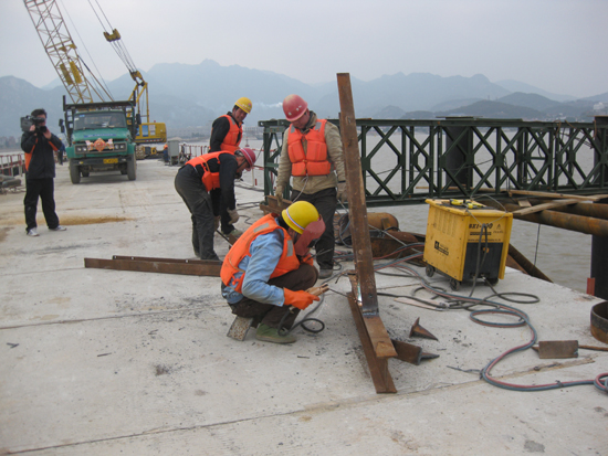 头戴钢盔身穿红色救生衣的建桥工人正在紧张劳动,许多大型机动吊车在起吊作业,许多施工车辆在不断穿梭运输,许多处电焊的蓝色弧光十分耀眼。
