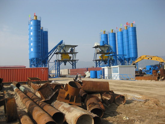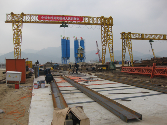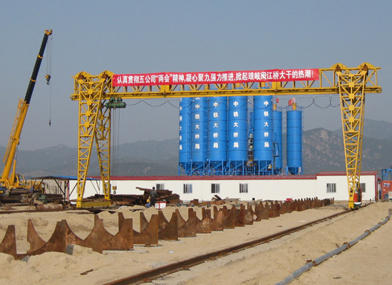 两座高大的龙门吊和新建的混凝土搅拌站格外引人注目。龙门吊车在地面轨道上平稳运行,传送着大型建桥部件。混凝土搅拌站将高效、环保地生产各种型号混凝土。高高在上的十只蓝色圆筒是水泥仓,千万吨水泥将从这里送入主机,调制成高质量混凝土以供建桥工程的需求。