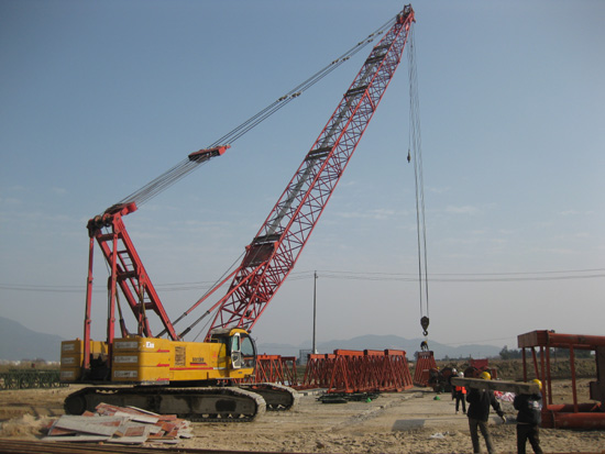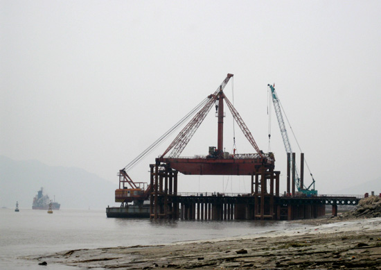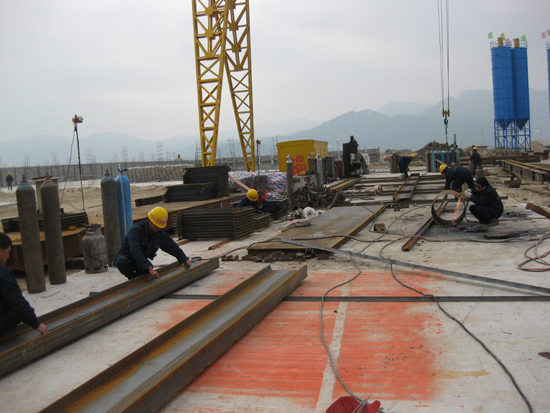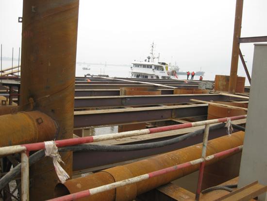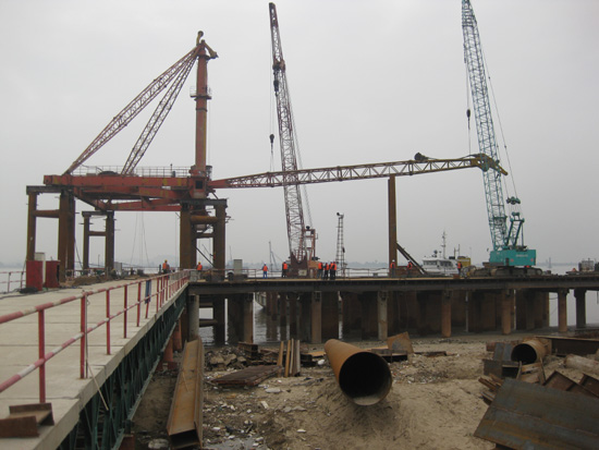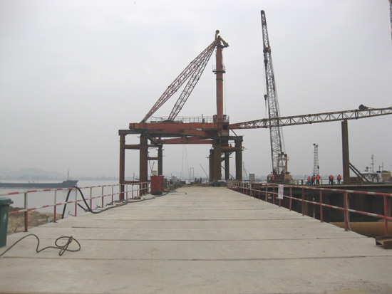 首先进行的是栈桥工程。栈桥是大桥建设的施工便道,是施工材料、设备的存放处,是建桥基础性工程和控制性工程。琅岐闽江大桥栈桥由中铁集团大桥局承建,全长640米,宽8米,投入资金超过1500万元。经过五个多月的紧张施工,12月18日,最后一块混凝土桥面板铺上了,从此,栈桥从琅岐岸边向江面延伸了460多米,横卧在波涛汹涌的闽江口江面上,非常壮观。