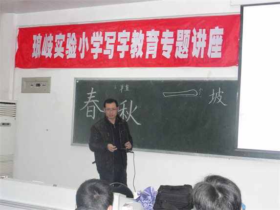 前不久,为了更好地创建国家级规范汉字书写教育特色学校并结合岗位大练兵,我校陈飞校长,邀请了书法家严祖喜老师,在我校四楼多媒体教室为全校老师进行了一场写字教育专题讲座。严老师从最基本的笔画教起,一直到基本间架结构,共花了两节课的时间。他认为,基本笔画中要注意横平竖直的写法。基本的间架结构中:左右结构的要写得瘦长正紧;上下结构的要写得扁齐正紧。在场的领导、教师受益匪浅。