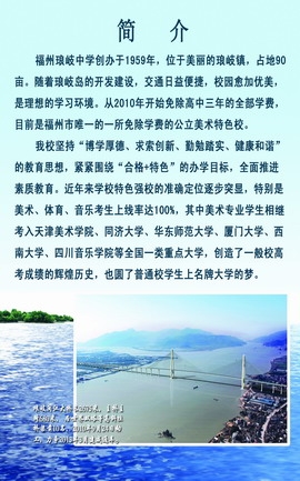 福州琅岐中学作为马尾区公立普高,从2010年开始免除高中三年的全部学费,目前是福州市唯一的一所免除学费的公立美术特色校。学校自1959年创办,坚持“博学厚德、求索创新、勤勉踏实、健康和谐”的教育思想,紧紧围绕“合格+特色”的办学目标,全面推进素质教育。近年来学校特色强校的准确定位逐步突显,特别是美术、体育、音乐考生上线率达100%,其中美术专业学生相继考入天津美术学院、同济大学、华东师范大学、厦门大学、西南大学、四川音乐学院等全国一类重点大学,创造了一般校高考成绩的辉煌历史,也圆了普通校学生上名牌大学的梦。