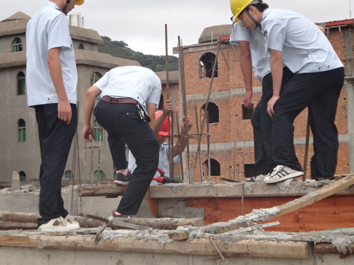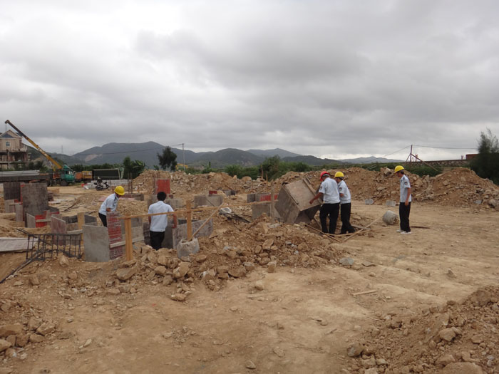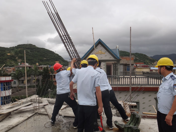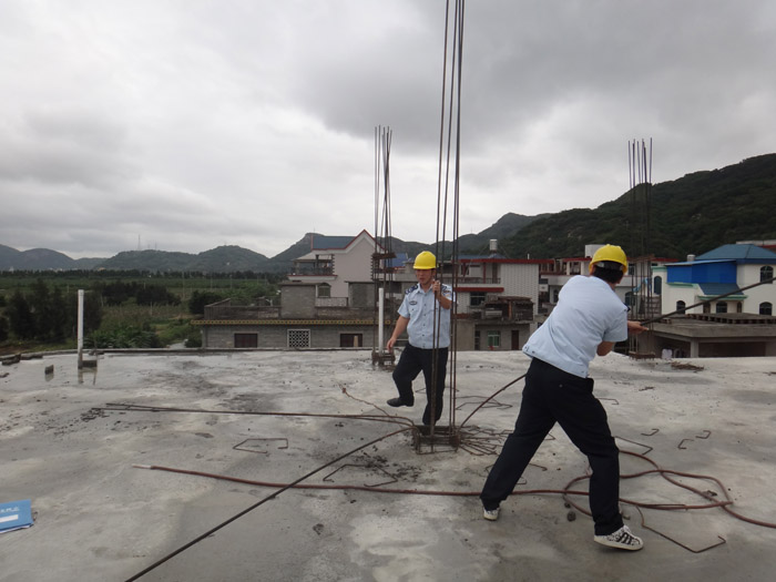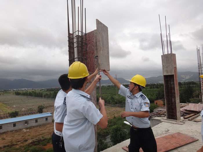 在朱颖、朱宇茂、杨其海违建地点,清违人员用液压钳剪其数个柱子的钢筋,并让土地协管员通知户主停工,以及要求自行拆除余下的钢筋及地基。