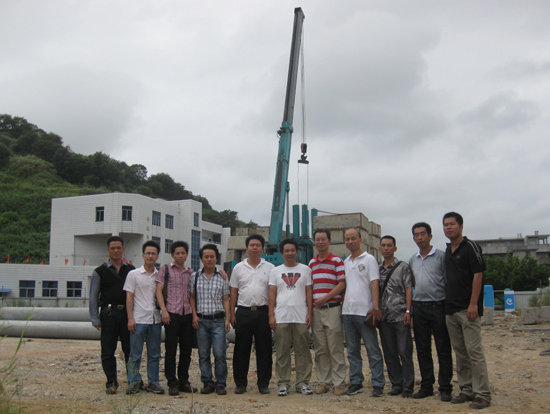 学校领导和工程技术人员欣喜地在工地上庆祝开工