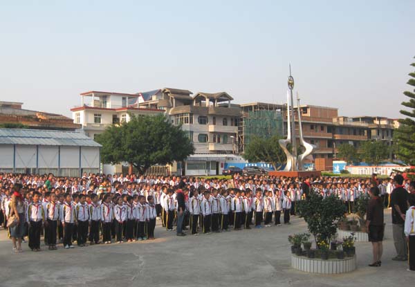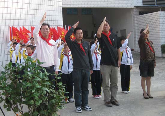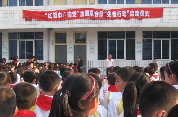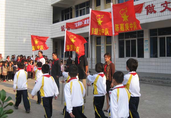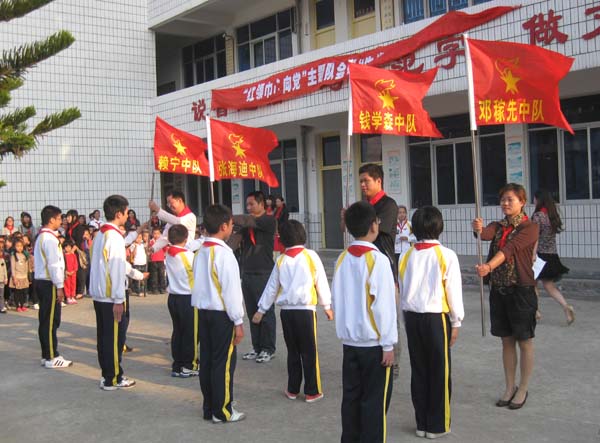 学校领导向少先队各中队授予以典范人物命名的中队队旗。少先队员们排着整齐的队伍在队旗下庄严宣誓:“时刻准备着,为共产主义事业而奋斗!”