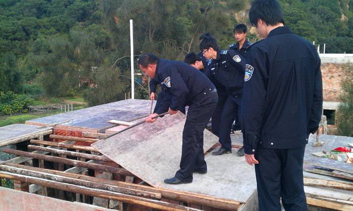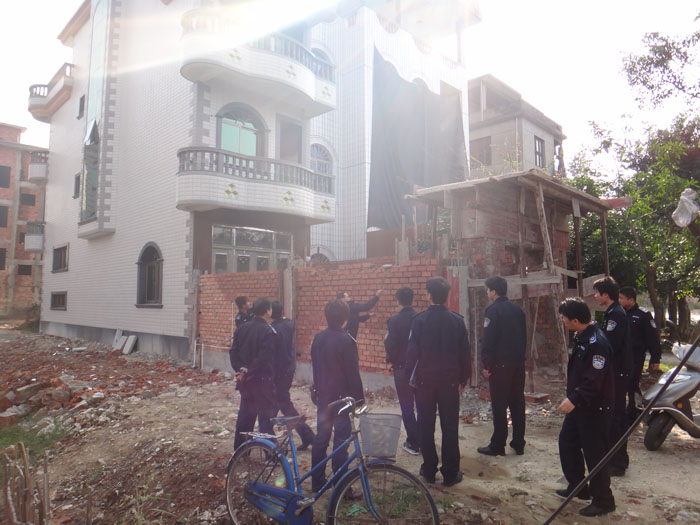 下午,清违执法人员巡查到云龙东岐时,发现户主翁香官还有工人抢建,清违人员当场制止并叫工人停工,强制拆除了楼顶的模板。