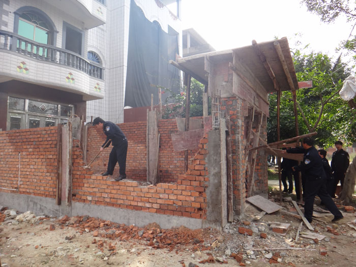 11月21号上午,清违办人员在日常巡查时发现其并未自行拆除围墙。执法人员花了2个小时拆除户主江敬章违建围墙的两面墙体和雨篷顶上水泥板,之后,该户表示两天内自行拆除余下部分。