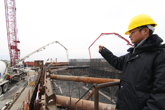 现场值班技术人员正在观察浇筑混凝土的温度。