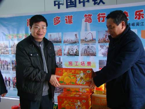 蓝锋书记和张依俤总经理分别代表琅岐经济区管委会和琅岐路桥公司向项目部的全体职工致以了节日的祝福和新年的问候。他们高度赞扬了琅岐闽江大桥Ⅱ标段项目部的全体员工在过去一年里所付出的辛勤努力和取得的可喜成果,对琅岐闽江大桥Ⅱ标段的施工质量、安全控制、工程进度表示满意,并祝福中铁大桥局在新的一年中取得更多骄人的成绩,并向琅岐大桥项目部赠送了猪肉、大米、食油等慰问物品。