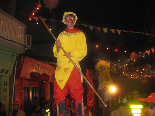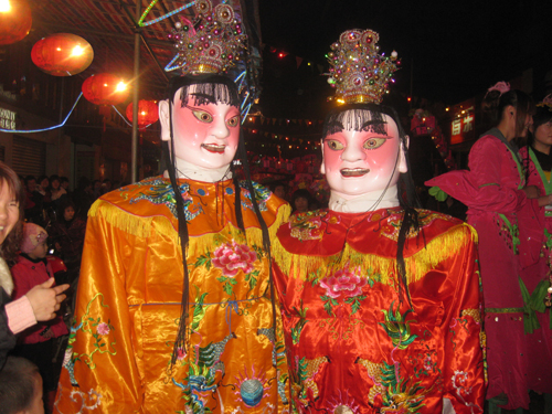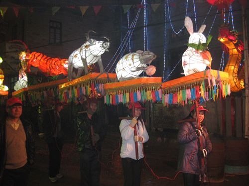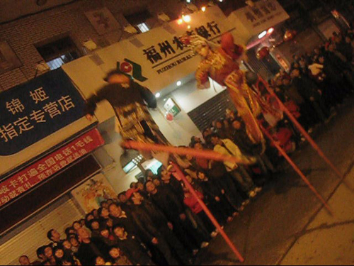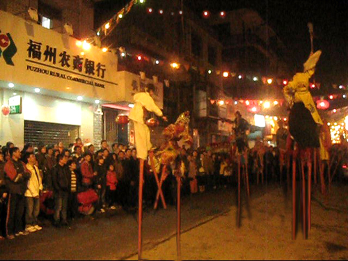 今年是龙年,两条巨型龙灯特别引人注目。电光闪闪的巨龙在人们的簇拥下蠕动前行。龙灯之外还有十二生肖灯和各种各样花灯,光彩夺目,十分壮观。游灯队伍中还加入琅岐民间文艺锣鼓队、十番乐队、高跷、肩头戏,尤其是今年请来莆田民俗文艺表演队的“高高跷”,表演出神入化,惊心动魄。十几个小伙子脚登在近两米高的高跷上做各种高难动作,表演“孙悟空闹天宫”和“八戒娶亲”,戏曲与杂技完美结合,既刺激,又给全新视觉享受。整个“迎灯”过程,气氛极热烈,围观者人山人海,热闹非凡,比游神活动更夺人眼球!
