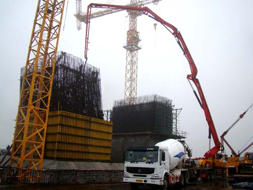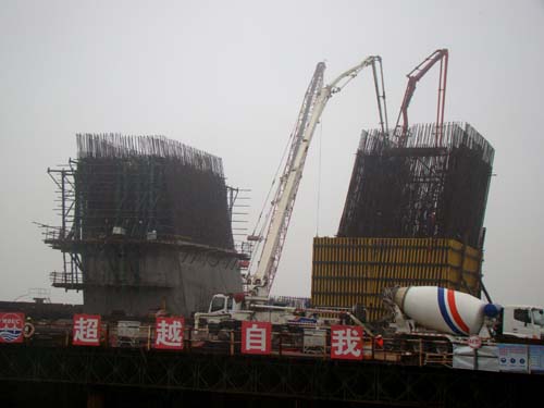 琅岐闽江大桥Ⅱ标段4号主塔墩(琅岐一侧)工地,混凝土运输车源源不断的向两台天泵输送着混凝土,现场工人正紧张施工,4号主塔墩下游塔柱开始浇筑首节混凝土,标志着琅岐闽江大桥主塔墩全面进入塔柱施工阶段。