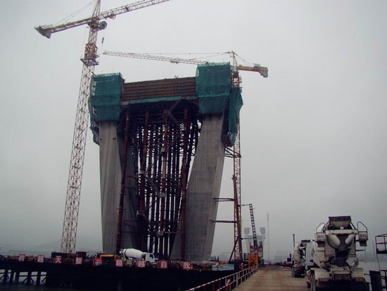 琅岐闽江大桥4#主塔墩为钻石型钢筋混凝土结构,塔高223米,为福建同类桥梁第一高塔。由下、中、上塔柱及下横梁、中横梁、上横梁6部分组成,是主塔墩施工的重要关键控制节点。此次浇筑的下横梁为等高粱,横梁箱形截面为